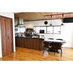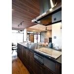 和室とキッチンの仕切り壁を取り払いLDKにし、キッチンの天井を板張りにしました。ランダムに張られたブラックウォルナットが空間にアクセントをもたらします。リビング側には大小の収納を設けました。 散らかる原因1位と言われる書類も、まとめてすっきりとしたリビングに。季節家電品も収納出来るようにしました。