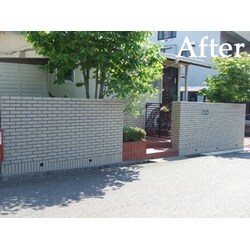 既設の玄関アプローチ(レンガ調)に合う、タイルのご提案をさせていただきました。外塀に水が回って、塗膜が亀裂を起していたので、高圧水洗でしっかりとばし、乾燥を充分した上で、施工を行いました。