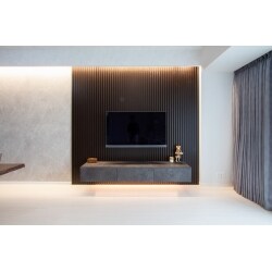 壁掛けテレビの背面にウッドパネルを設置しました。天井とテレビボードの下に間接照明を入れ、ウッドパネルをより美しく、奥行のある空間を演出しました。