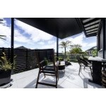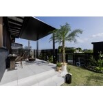 元々全面コンクリートだった広い駐車場を、お庭にリフォームしたいとのご相談を受け、植栽を楽しめるスペースを作りました。広い駐車場の一部を活用し、目隠しフェンスと植栽スペースで囲み、道路からの視線を遮るプライベートガーデンを実現。ワンちゃん用にドッグポールを設置し、安心して遊べる空間に。掃き出し窓の前には「テラスSC」を設置し、直射日光を防ぎ、夜も使えるダウンライトやコンセントを設置。目隠しフェンスやテラスはお家の雰囲気に合わせ、ブラックとダークブラウンで統一しました。天然芝と植栽スペースで自然を感じられる、お家全体が緑に囲まれた広々とした空間となりました。