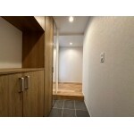 玄関収納の建具をアンダーカットし、そのまま既存利用できるよう施工。各部屋との段差をなくすために置き床を組んでナラフローリングを張り込んだ。