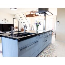 キッチン・カップボードの扉柄はボルドーからブルーグレーオークに、カウンターは人大からルミナスブラックのクウォーツカウンターになり印象が大きく変わりました。上品さと可愛らしさが両立したY様らしいカラーコーディネートです。