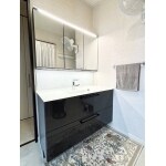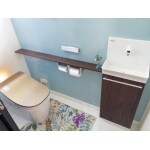 沙金の便ふたとトイレ背面のライトにより、空間がゴージャスになりました。また、背面の収納を撤去し、代わりに収納付きの手洗いカウンターを設置したことで、トイレ全体が広々とした印象に。