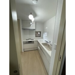 白を基調としたキッチンに交換しました。入口を広くしたことで広々と使えますね。床はフローリングでしたが壁の撤去後が見えてしまうのでクッションフロアに交換しています。