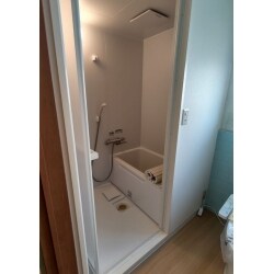 賃貸物件の一体型のお風呂とトイレを分けて独立した浴室・トイレに分離しました。 浴室にはシンプルデザインのユニットバスを導入しました。 さらに台所や和室なども一新し、和室の畳をクッションフロアへ変更しています。 暗い印象だった和室やキッチンが明るい雰囲気に生まれ変わりました。