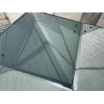 南側と西側の屋根部分です。写真左上部が南面で右下が西面です。陽の当たる南面は塗膜が剥がれていて下地のコンクリート質の機材が見えています。西面は更に植物細胞が繁殖していて褐色に汚れています。