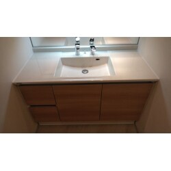 広々快適で使いやすく、掃除がしやすい洗面化粧台へリフォームしました。 広々カウンターは洗面空間を上質に優雅に彩るボウル一体タイプ。ボウルとカウンターがつなぎ目なく形成されているので、汚れがたまりにくくお掃除がとても簡単です。 2段の引き出しには化粧瓶や小物類などを効率よく収納できます。扉を閉めるとき、静かにスッと引き込むソフトサイレンス機構を採用しています。 空間に広がりを与える浮遊感のあるキャビネットデザインです。 けこみ部分にはストック収納として活用できるけこみ収納があり、十分な収納容量を確保します。 クッションフロアも貼り替え、1ランク上質な空間になりました。
