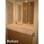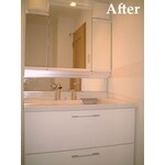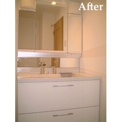 特にこだわったのは洗面化粧台です。 洗面器一体型のカウンターで、継目がなく広い作業スペースを確保できます。 梁があり背の高い化粧台は取付不可能でしたが、今回採用した化粧台はリフォーム対応タイプがあり、全高が1780mmのため、 きれいに収まりました。 工事内容 洗面化粧台: INAX ラルージュ コンポタイプ トイレ: TOTO ピュアレストEX