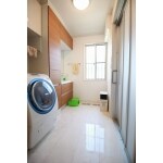 洗面台と洗濯機が横に並び、お風呂と向かい合うようにすることで、スペースを広げました。お風呂の扉を引き戸にすることで、可動域で場所を取らないので、最大限にスペースを活用できます。洗面所とお風呂の段差もなくなり安心です。