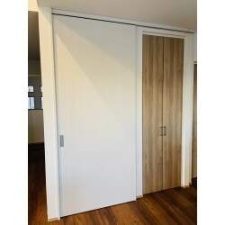 ご要望と安全性・見た目を考え、引戸を提案させていただきました。 また、まわりのクロスの色見・部屋の雰囲気などを考え、ドアの色は白を提案させていただきました。