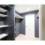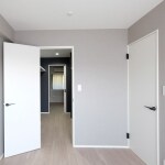 大容量のウォークインクローゼットスペースを確保するため、最小限のスペースでご提案しました。 クロスは、他の部屋との差別化と特別感を演出するため、壁全面に色クロス、天井のみ白クロス、というご提案をしました。 淡いグレー色を選ばれ、グレー×白のやさしく落ち着く空間に仕上がりました。