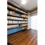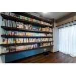 壁面に6段の棚板を設置し、たくさんの本をしまえる大容量の本棚に。梁も本棚でうまく隠れています。下側はお掃除ロボットの収納スペースにできるようにコンセントを設置しています。