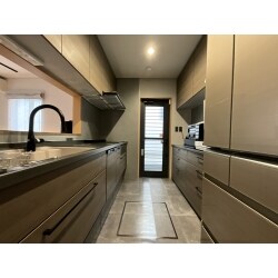 床はフロアタイルに貼替、キッチン本体もカップボードも、扉面材:リファインドモカに、カウンター:サンドブラックを合わせてシックなキッチンに仕上げました。