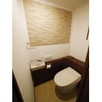 LIXILのタンクレストイレサティスS 手洗い統合にして、コンパクトにスッキリまとめました。 背面のキャビネットの加工がかなり難しく、職人さんの腕でピッタリと収まっています。 エコカラット のカームウッドを貼り全体を白とベージュでまとめています。 このトイレなら、遊びに来たお友達にも見て欲しくなりますよね。