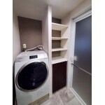 洗面化粧台の向かい、洗濯機スペースと可動棚の背面の壁はアクセントクロスを入れ、上品な空間へ。
