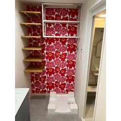 洗濯機置き場背面にお選びいただいたクロスを貼りました。収納が不足していたので、可動棚をセットし、ロールカーテンでサッと目隠しできるよう設計しました。