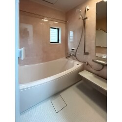 既存のピンクの壁を気に入られており、加えて高級感を出したいとのご希望でした。 大理石調の模様が入った『マテリアルピンク』をご提案。 更に、浴槽・エプロンをピンクにし、統一感と高級感がアップ。 また床・カウンターをベージュにすることで汚れも目立ちにくくなりました。
