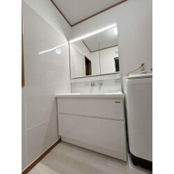 洗面横の壁にパネルを貼っているので、拭き掃除が可能。汚れも簡単に拭き取ることができ、キレイが長持ちします。