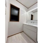 TA社のファミーユを設置致しました。 洗面横の壁にパネルを貼っているので、拭き掃除が可能。汚れも簡単に拭き取ることができ、キレイが長持ちします。 収納は引き出し式になり、奥に置いていあるモノも簡単に出し入れできるようになっています。 また洗面台の交換に合わせて、クロス床CF工事も行っています。