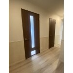 リビング入口のペットドア。猫ちゃんも自由に行き来が可能です。キッチンカウンターと飾り棚上にはダウンライトを取付けしました。フローリングは家具や建具に合わせたグレイアッシュのカラーを選択しました。
