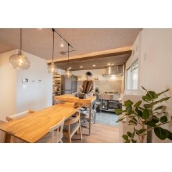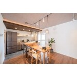スペースを有効に使うために壁付けのオープンキッチンをご提案。圧迫感の無いフレームキッチンに加え、使い勝手に配慮した、対面カウンターを設置。ダイニングテーブルを隣接させて回遊できるようにしました。
