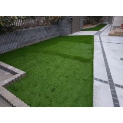 植栽と芝の撤去後、コンクリート打ち込みと人工芝を敷設しました。お庭の角にはインターロッキングを移設して花壇を施工しました。リフォーム前のお庭と比べて草むしりや剪定などの手間が不要になった分、管理しやすいサイズのスペースでガーデニングを楽しんでいただけます。 お庭全体が自然の優しい印象に包まれた癒しの空間に仕上がりました。