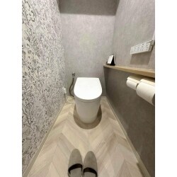 T社のネオレストAS1を設置致しました。 長めのカウンターを新たに取付したことで、ちょっとした小物が置けるようになりました。立ち座りのサポートにも活用できます。 内装も特徴的でお洒落なデザインになっており、良いトイレ空間に仕上がりました。