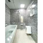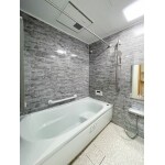 594.モダンな石目柄が清潔感溢れるオシャレで快適な浴室。