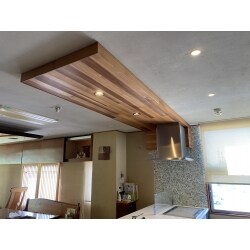 - 最新のレンジフードと無垢板貼りのデザイン天井