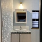 洗面台はウッドワンの無垢の木の洗面台との事で、弊社でも取り扱いがあるので問題なくご提案できました。数回お打合せをして素敵なモザイクタイルのカウンターと框組扉付ミラーキャビネットをご採用いただきました。 照明器具も工事前にサイズ等問題なく取付できることを確認した上で、お施主様ご支給で取付いたしました。